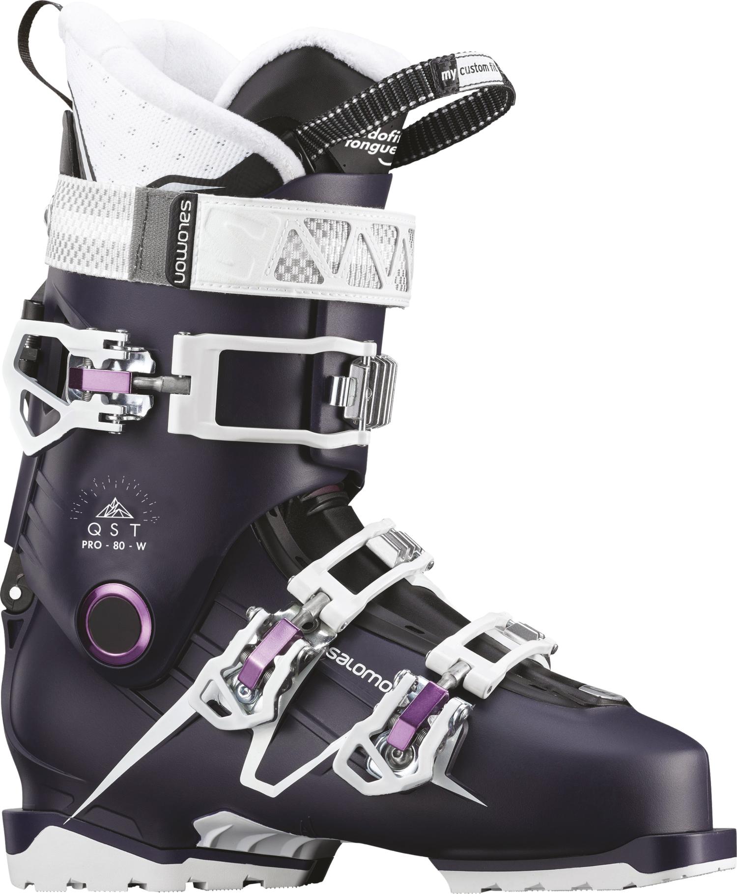 Ботинки горнолыжные Salomon 18-19 QST Pro 80W Eggplant/Purple - базовая модель многоцелевых ботинок с жесткостью 80. Обеспечивают эффективную передачу энергии благодаря использованию технологии Twinframe 2 с инжектированным полиамидом в области подошвы и задней стенки голенища, которые придают дополнительную жёсткость и отличную отдачу в быстрых поворотах.