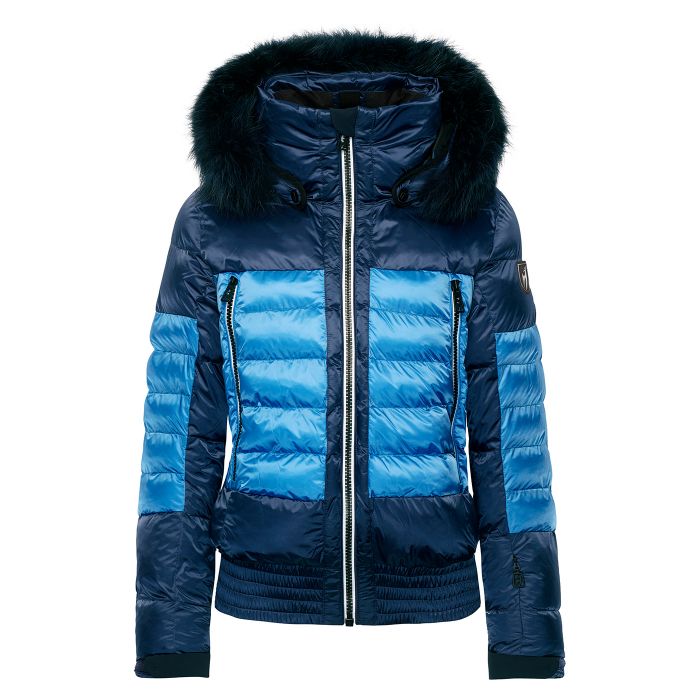 Женская горнолыжная куртка в стиле "блузон" из мерцающей жемчужным блеском ткани Shiny Pearl. Двухцветная стеганая Muriel Splendid Fur смотрится очень эффектно благодаря широкой резинке, контрастной бело-синей молнии и роскошному капюшону с опушкой из натурального меха.